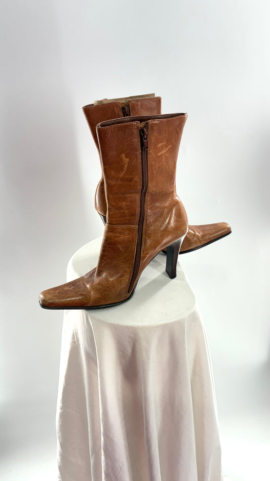 Vintage 1990s STEVE MADDEN Joesie Distressed Leather Pointed Square Toe Booties Made in Brazil (8)