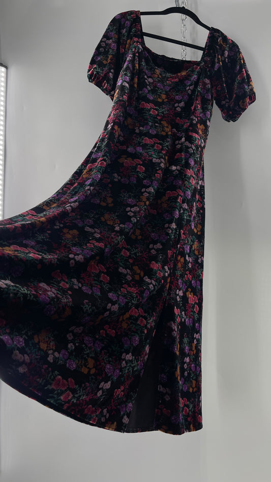 LOFT Velvet Dark Floral Full Length Dress with Puff Sleeves and Smocked Back with Tags Attached (8)