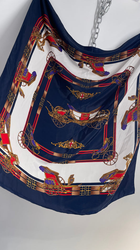 Vintage DOPHIO Italy Navy, White Equestrian Horse Drawn Wagon/Carriage Graphic Scarf