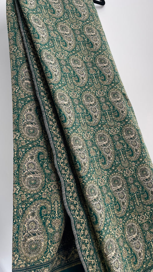 Vintage Pashmina Green Paisley Fringe Scarf