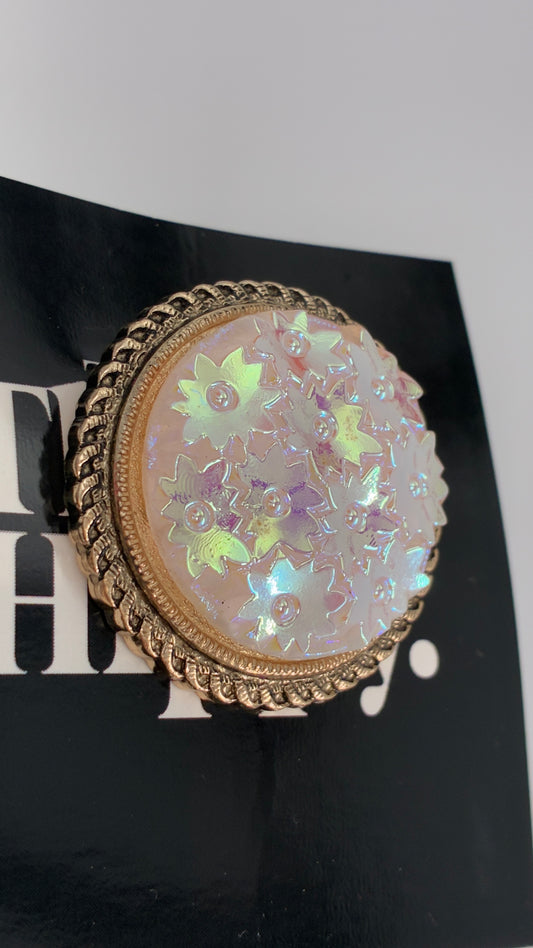 Vintage Scarf Ring Loop with Gold Metal Border and Iridescent Flowers
