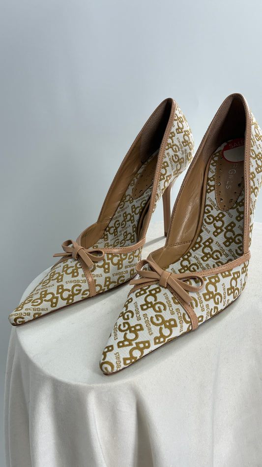 Vintage BCBG All Over Monogram Pointed Toe Heels with Leather Bows and Piping (5.5)