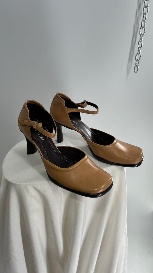 Vintage Nine West Camel Leather Square Toe Mary Jane Style Heels (8.5)