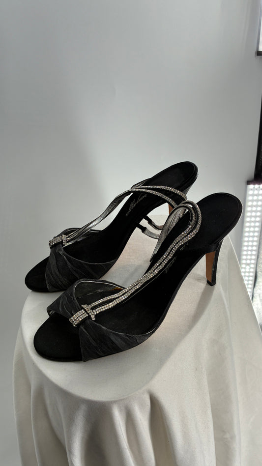 Vintage RAGAZZA Elegant Black Pleated Peep Toe Heel with Rhinestone Crystal Strap (8.5)