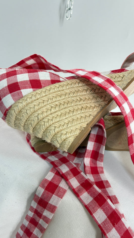 Vintage BETSY JOHNSON Jemi Gingham Red Tie Up Kitten, Wicker Wedge (6)
