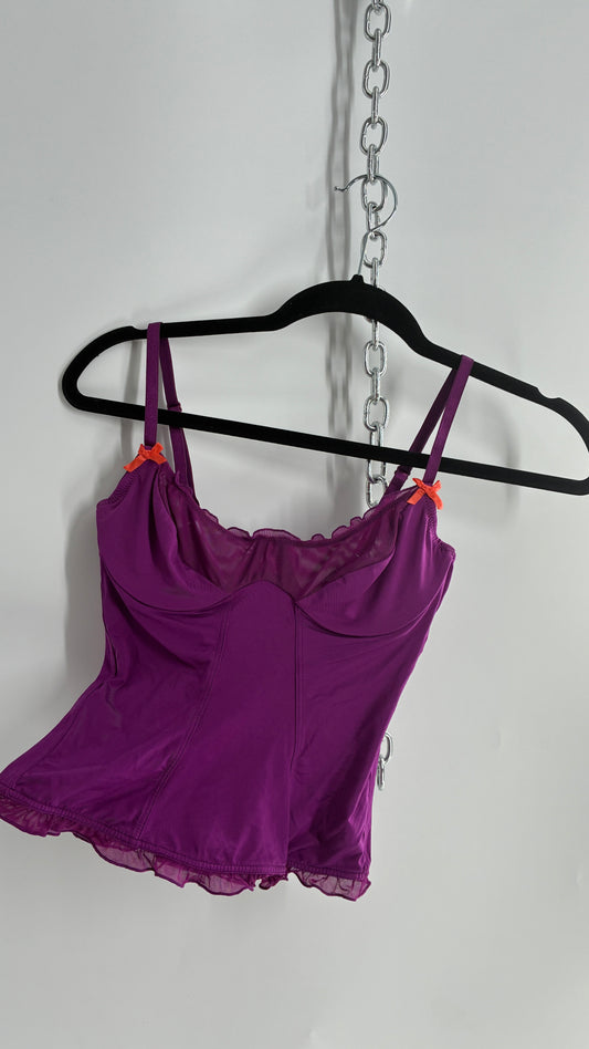 Vintage 1990s Purple Underwire Camisole Top with Sheer Ruffled Trim and Contrast Bow (Small)