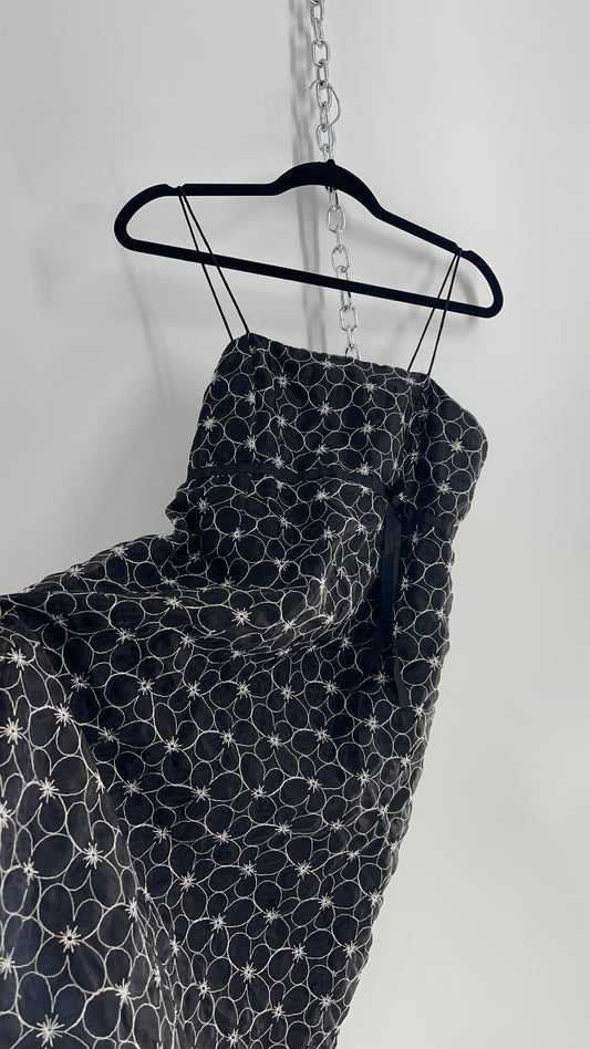 Vintage Motherhood Maternity Black Sheer White Floral Embroidery A-Line Dress with Underbust Ribbon (Small)
