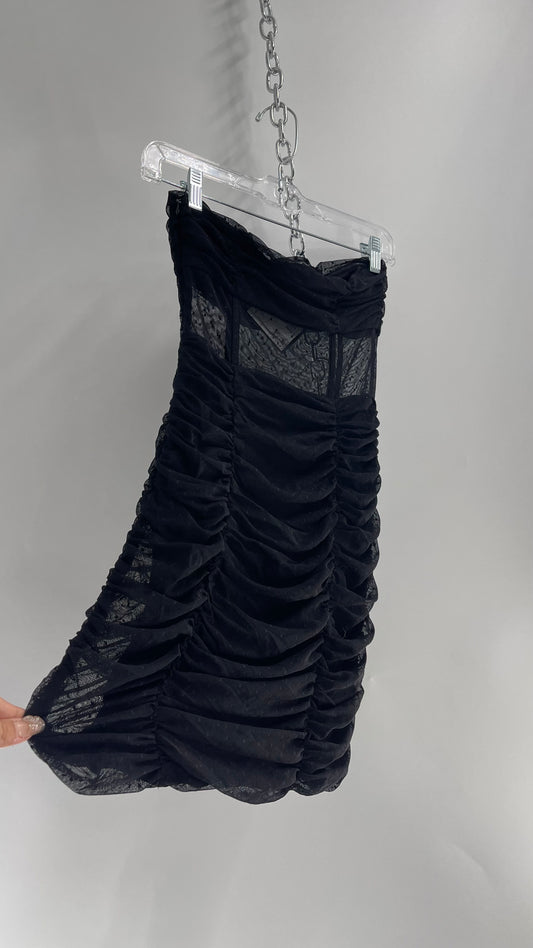 H:OURS Black Corseted Ruched Mini Dress with Underwire Cups and Sheer Panel (0)