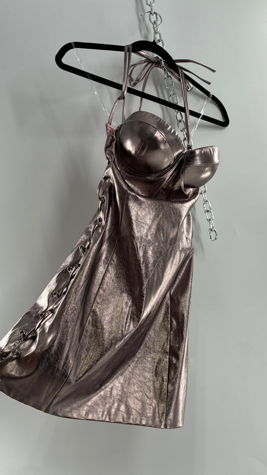Fashion Nova Vegan Leather Metallic Gun Powder, Lace Up Side Mini with Built in Cups (XS)