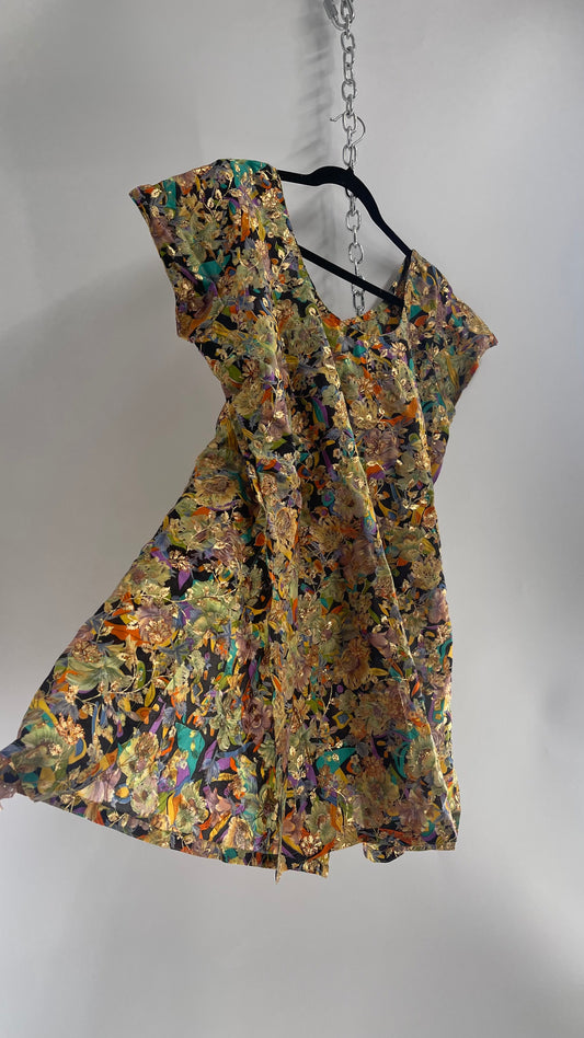 Vintage Imported Contrasting Floral Side Slit Tunic Silk with Hand Painted Glitter Details (Medium)