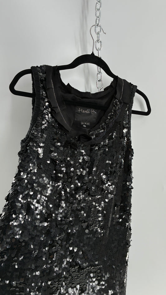 HANII Y. Black Sequin Mini Dress with Beaded, Pleated Ribbon Neckline and Bubble Hem (40)