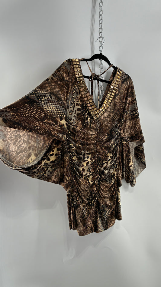 Vintage ZIZZI Metallic Animal Print Mini Dress with Draping Sleeves and Rhinestone Neckline (Large)