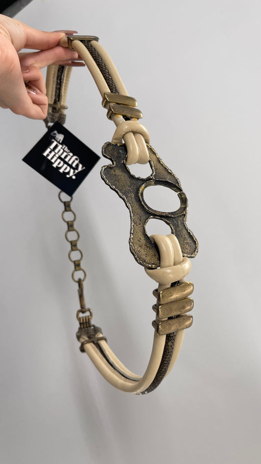 Vintage Abstract Cream Leather, Bronze Metal, Dragon Scale Metal Belt (C)
