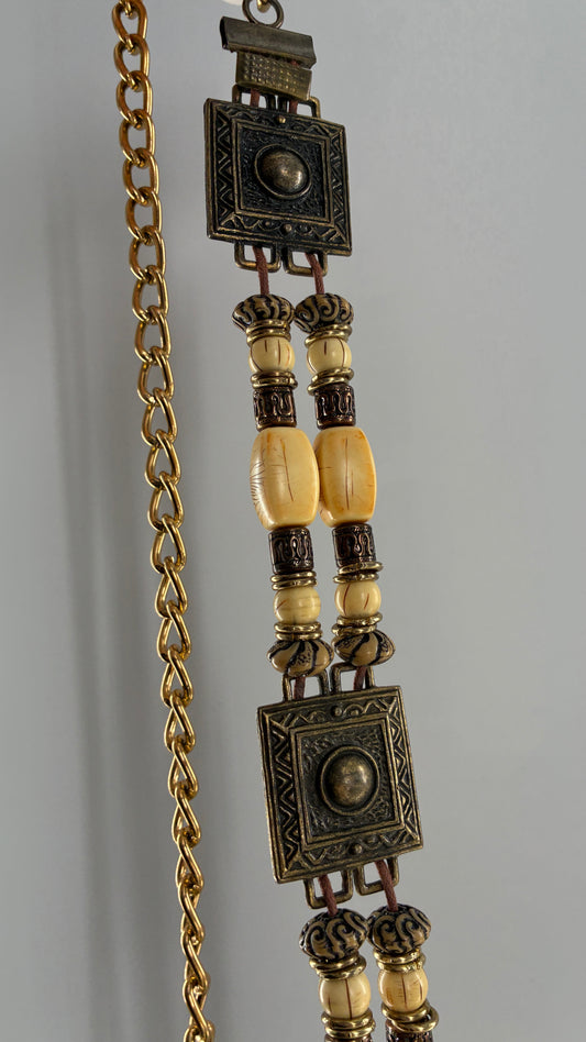 Vintage Beaded Chain Belt with Metal Square Medallions
