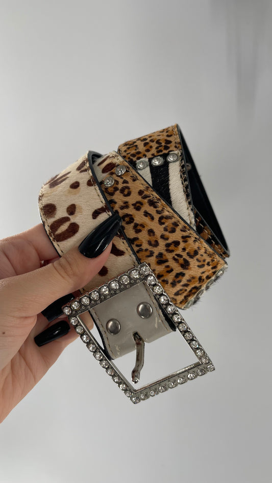 Vintage Pony Fur Animal Print Patchwork Belt with Rhinestone Buckle and Embellishments (Medium)