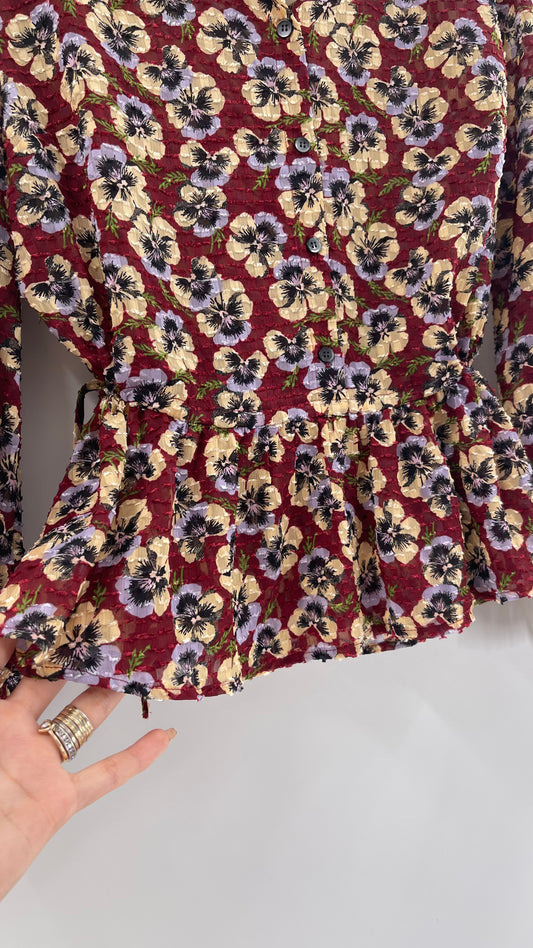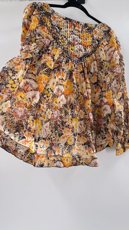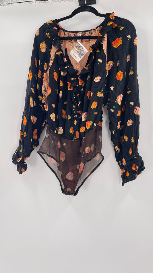 Free People Black and Peach Orange Floral Bodysuit with Balloon Sleeves (Small)