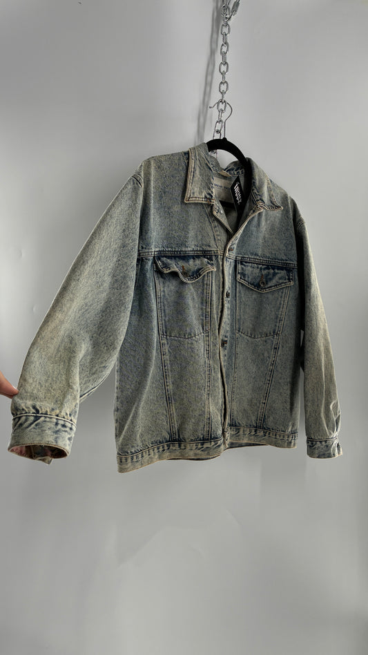 Vintage American Pacific Acid Wash Denim Jacket with Floral Patterned Cuffs (Large)