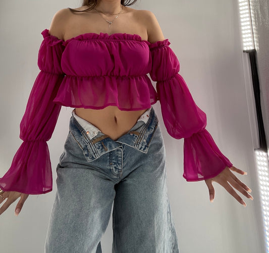 Fashion Nova Fuchsia Sheer Long Sleeve Crop (Small)