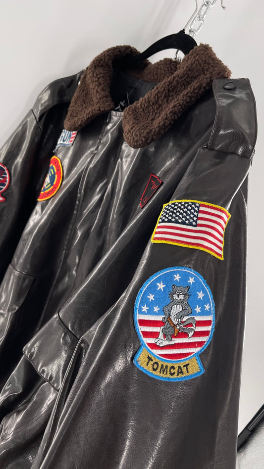 Vintage Dark Brown Top Gun Bomber Jacket with Patches and Teddy Sherpa Collar (Large)