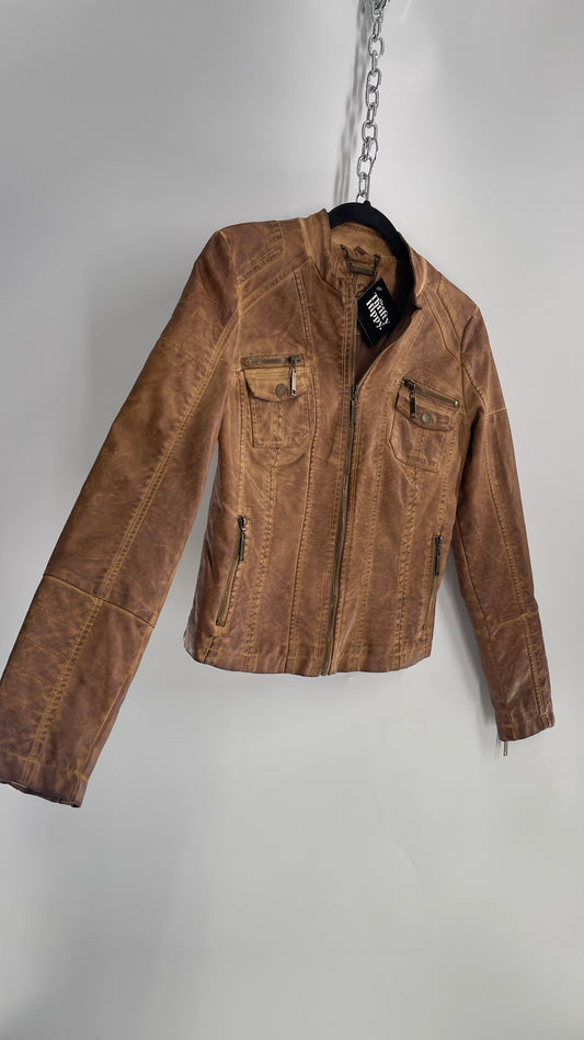 Vintage Brown Vegan Leather Distressed Motorcycle Jacket (Small)