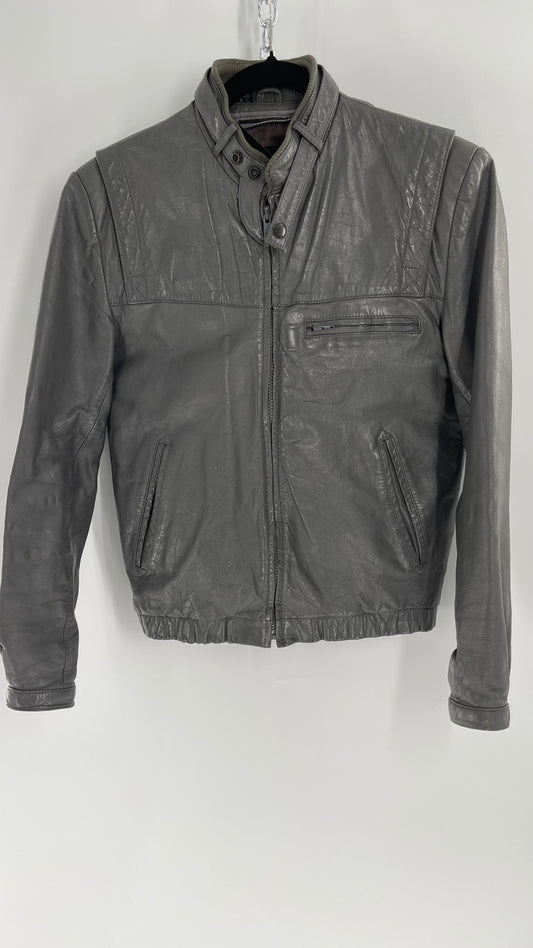 Vintage WILSON Gray Leather Motorcycle Jacket with Neck Strap (C)(36)