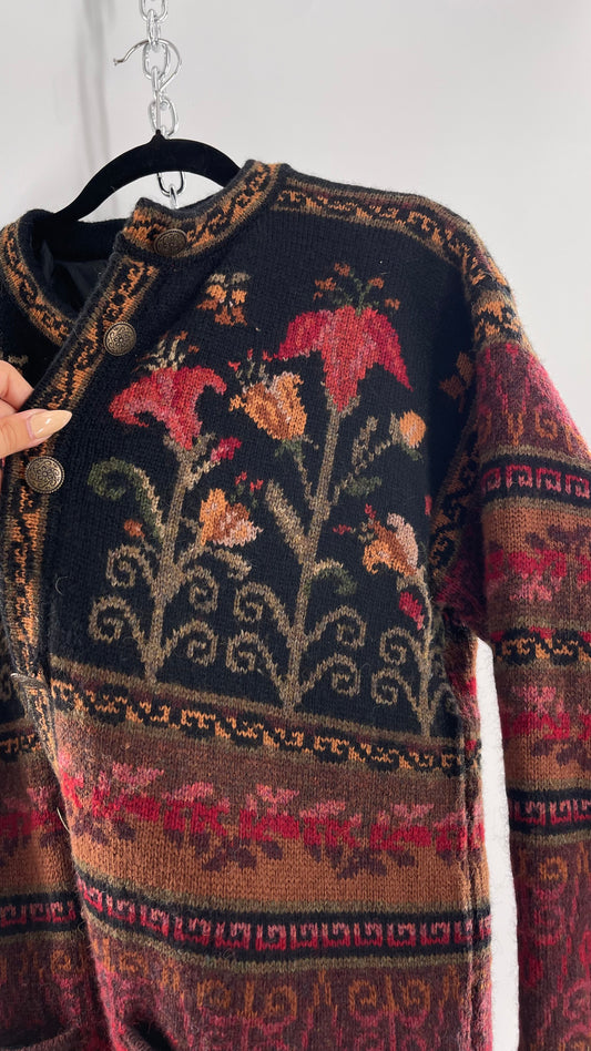 Vintage Iceland Design Wool Jacket with Brass Embossed Buttons and Folk Floral Patterning(C)(Medium)