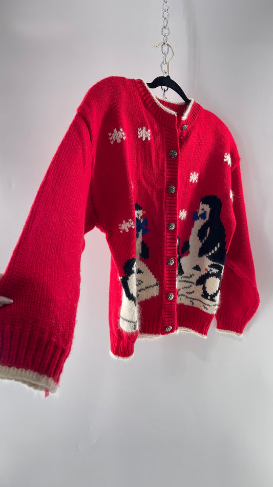 Vintage Karen Scott Silver Button Front, Red Cardigan with Shoulder Padding and the Sweetest Festive Penguins in Bow Ties (Large)