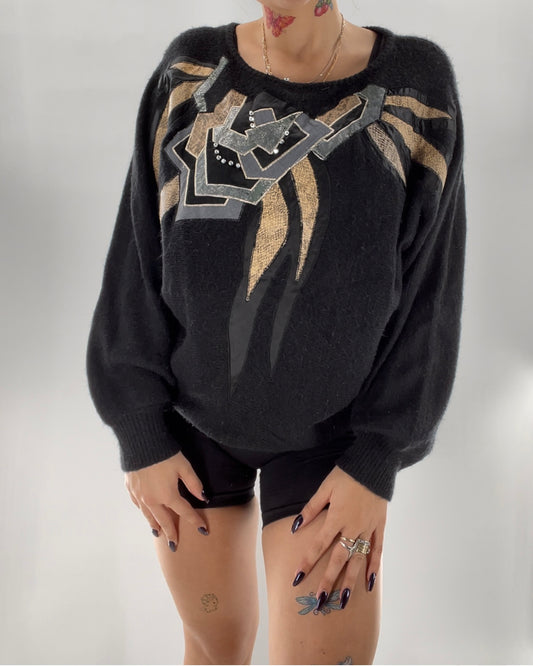 RARE 80s Vintage Adele Pastel Pink, Purple, Mint Silver Tinsel Sweater with Anime/Manga Art Style Pandas (Medium)