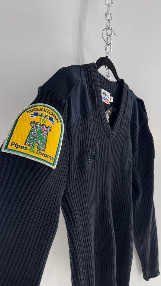 Vintage Pipes & Drums Navy Blue Ribbed Heavy Knit Sweater with Arm Patches and Badges (XL)