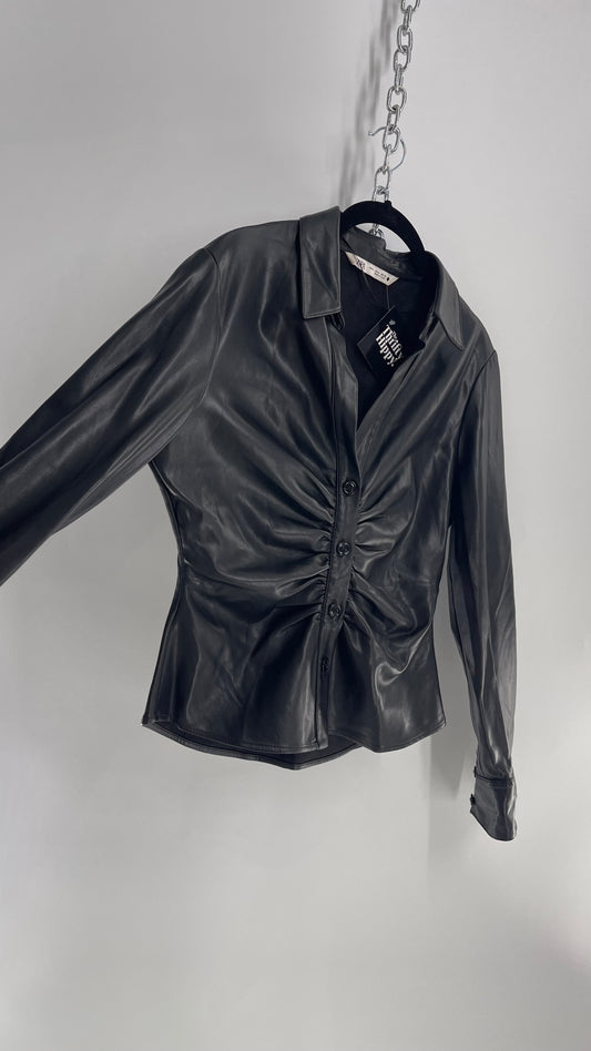 ZARA Vegan Leather Fitted Black Ruched Bust Button Up (M)