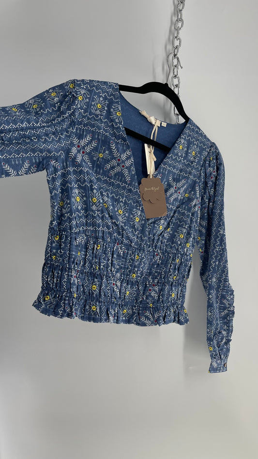 Flower That Girl Anthropologie Blue Patterned Blouse with Tags Attached (XS)