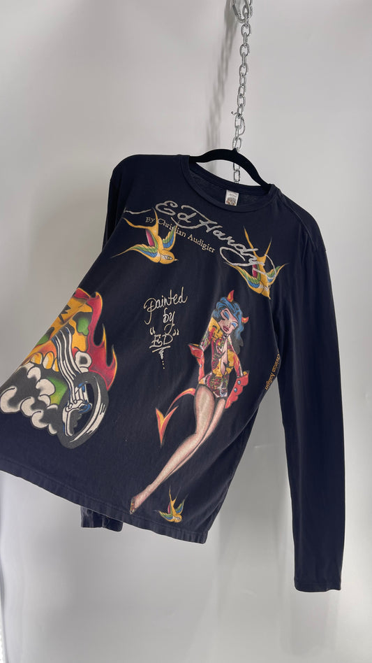 Rare Vintage Ed Hardy Pin Up Style Graphic Long Sleeve (Large)