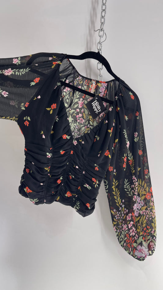 Free People Black Contrast Floral Bubble Sleeve Blouse with Ruched Bodice (XS)