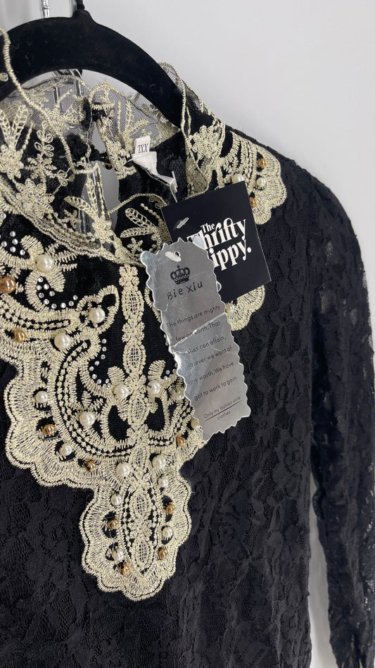 Biexiu Vintage Black Lace Semi Sheer Blouse with Ivory Gold Beaded Embroidered Neckline (Small)
