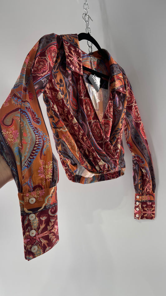 Free People Paisley Patterned Warm Toned Cross Front Collared Cropped Blouse with Buttoned Cuffs (XS)