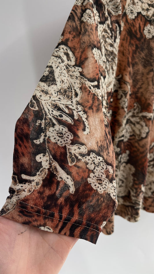 Vintage 1990s Lace Animal Print Cropped Quarter Sleeve V Neck (Medium)