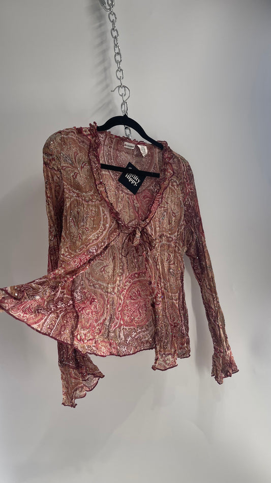 Vintage 1990s Sequin Crimped Pink Bell Sleeve Tie Bust Top (XS)