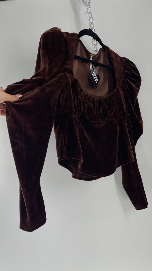 Free People Dark Brown Velvet Long Sleeve Cropped Blouse with Milkmaid Neckline and Renaissance Puff Shoulder (Large)