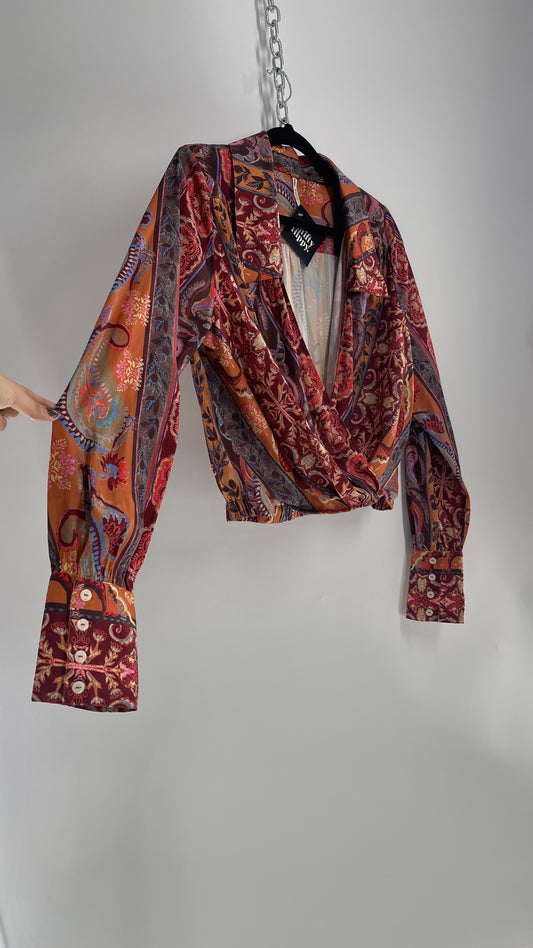 Free People Paisley Patterned Warm Toned Cross Front Collared Cropped Blouse with Buttoned Cuffs (Large)