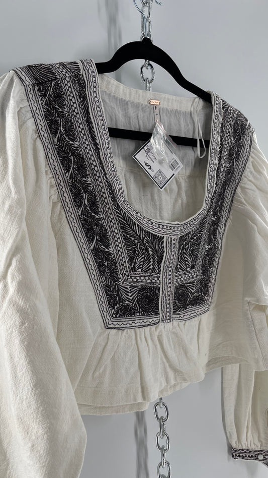 Free People White Thick Cotton Cropped Balloon Sleeve Blouse with Brown Embroidery (XS)