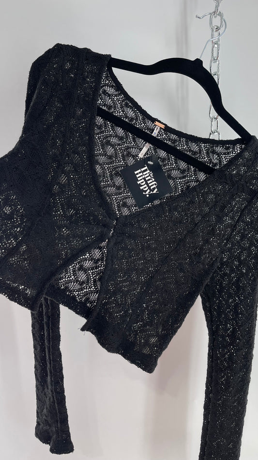Free People Black Knit Lace/Crochet Like Cropped Long Sleeve with Metal Buckle Bust (Medium)