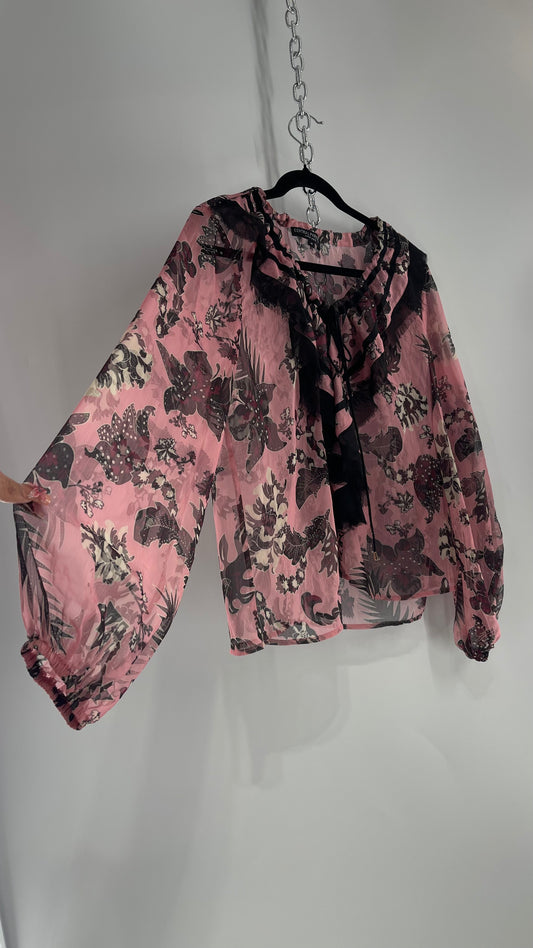 Central Park West Pink and Black Silky Ruffle Front Blouse (Medium)