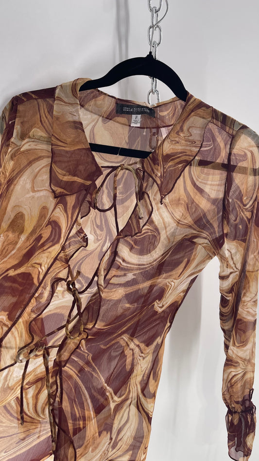 Urban Outfitters Marbled Brown Sheer Tie Front Balloon Sleeve Blouse (Small)