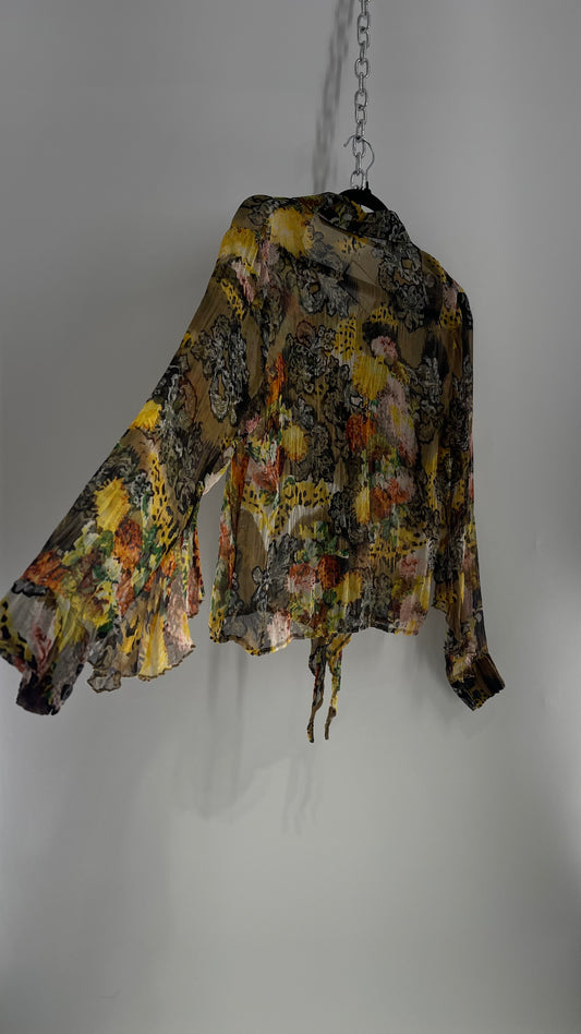 Vintage Sheer Animal Print Crimped Ruffle Bust and Sleeve Rocker Blouse (Medium)