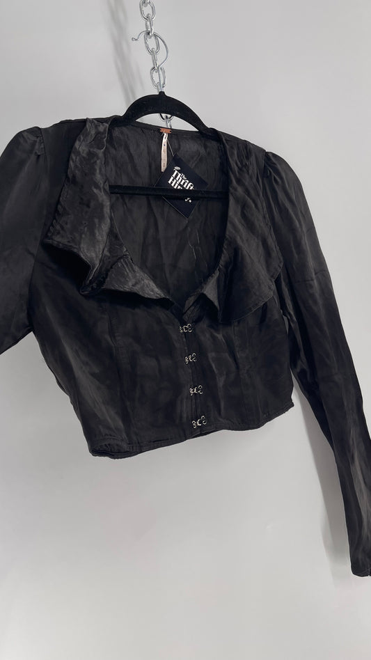 Free People Black Silky Ruffle Neckline Long Sleeve with Grommet Closure Details (Small)