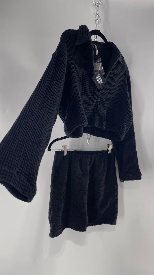 Free People Waffle Knit Black Cropped Button Up and Skirt Set with Tags Attached (Small)