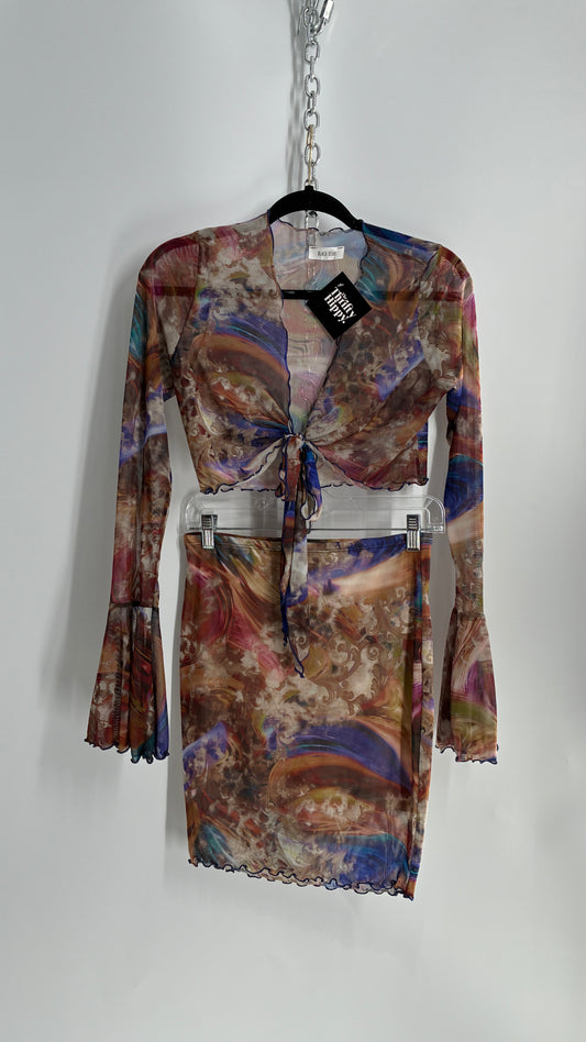 FASHION NOVA Rose Graphic Mini Skirt Tie Bust Bell Sleeve Crop Set with Tags Attached (XL)