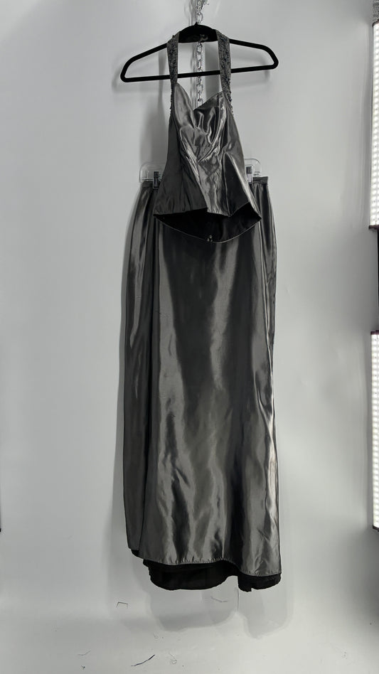 Vintage 1990s Davids Bridal SET Metallic Silver Corseted + Beaded Halter and Full Length Skirt (6Top, 8Skirt)