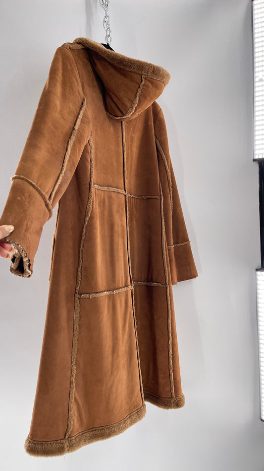 Vintage Faux Suede Long Hooded Coat with Fur Trim/Piping (C)(Medium)
