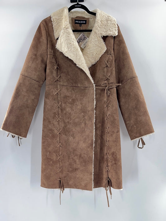 Prague Faux Brown Suede Shearling Lining Lace Up Detail on Sleeves and Front of Coat (Size Large)